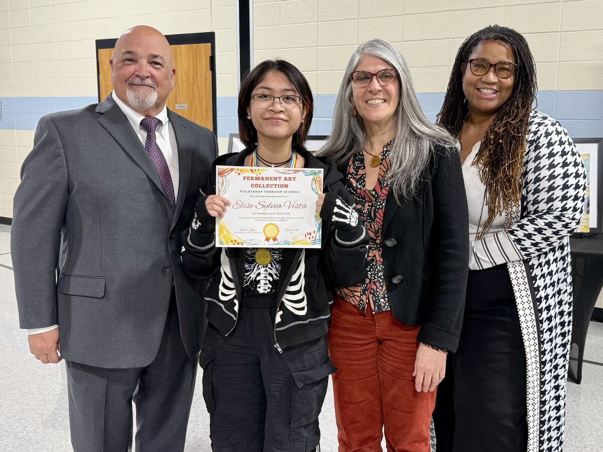 Congratulations to Elise Sylvia Vista, whose artwork was selected to be included in the district's Permanent Art Collection! A student from each K-8 school was celebrated on Thursday, March 13, along with their families in a ceremony at our Administration Building. The event displaying their beautiful artwork was hosted by Supervisor of Visual & Performing Arts Rebekah Sterlacci and attended by the Board of Education, district administration, and the students’ principals and art teachers.