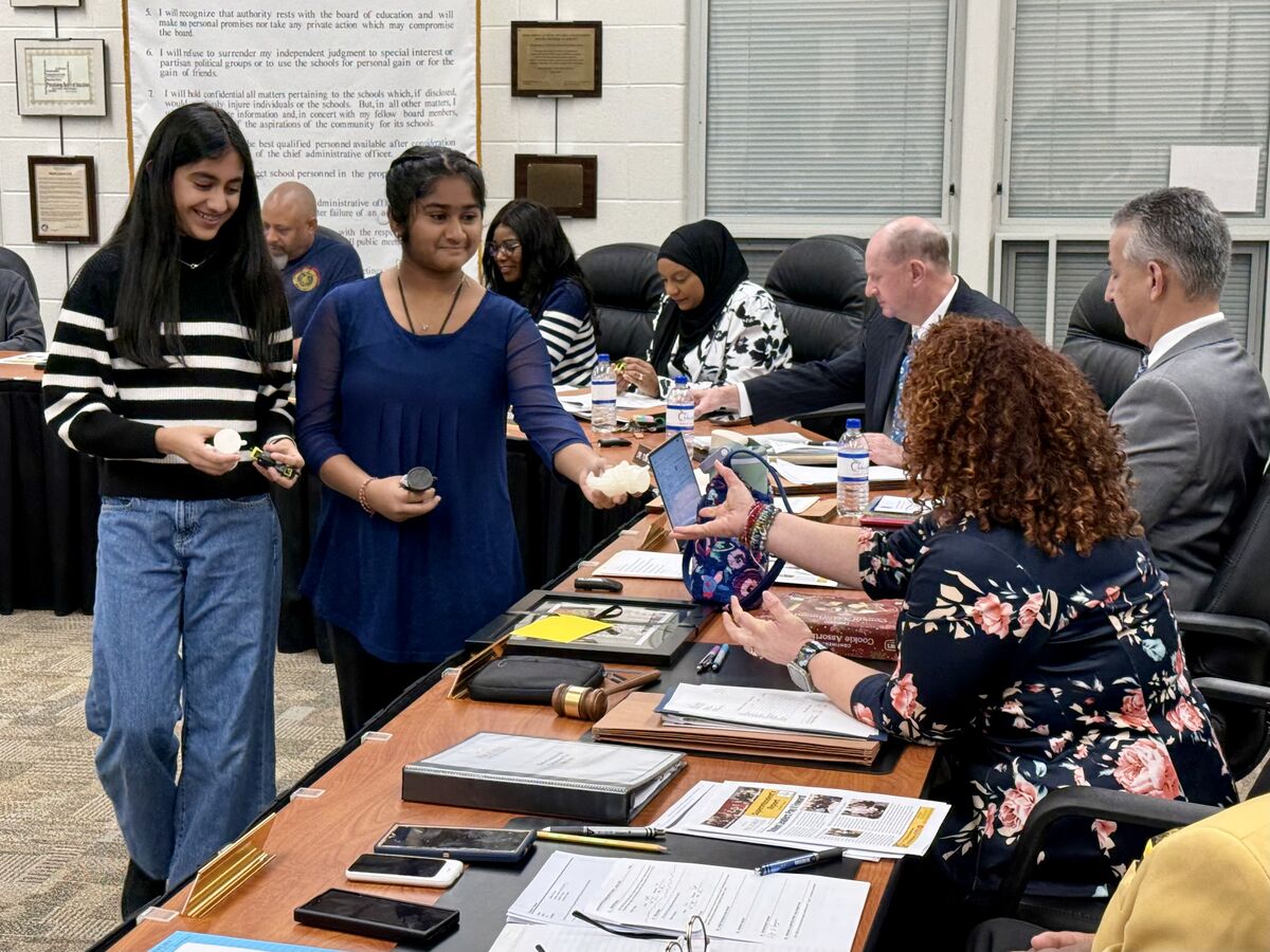 Board President Nancy Salgado-Cowan and Superintendent Erskine R. Glover presented the students with certificates for their commitment to their engineering studies and for sharing their talents with the Board. They were introduced and supported at the meeting by Quibbletown Principal William Gonzalez.